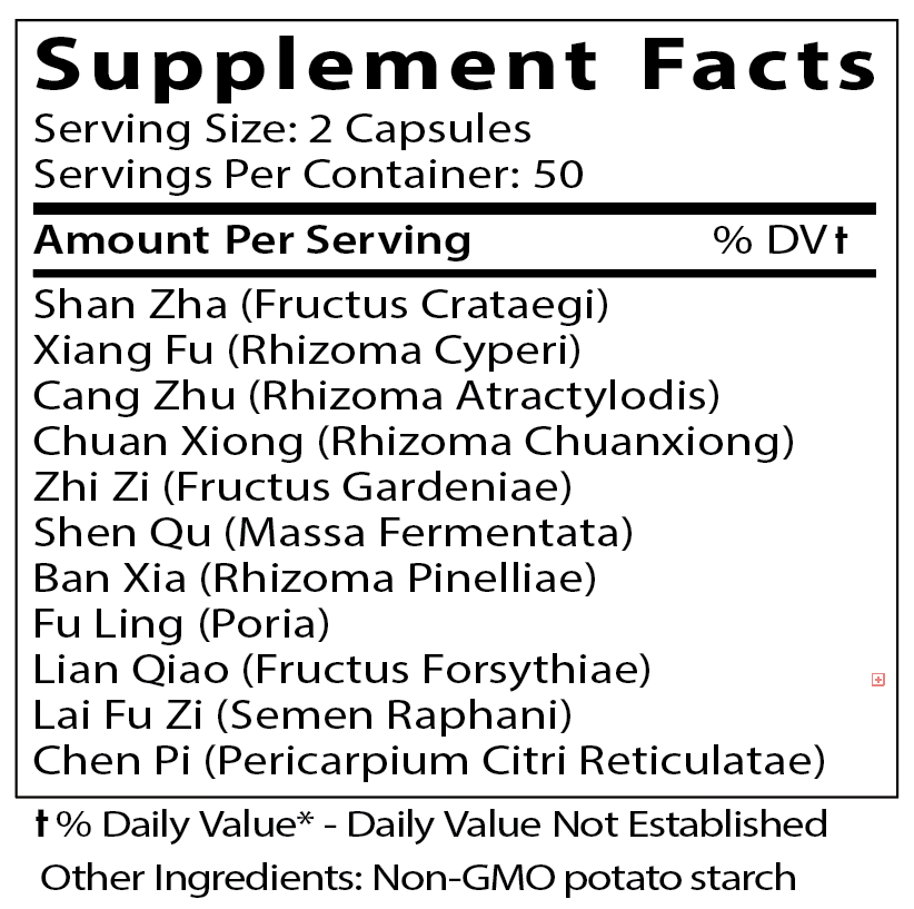 Note: This formula has the herb, Shen Qu (Massa Fermentata), which contains tree nuts, wheat, and gluten.
